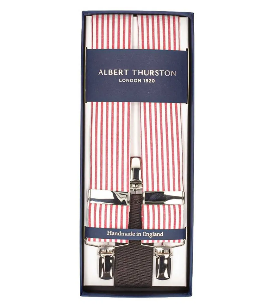 Fonctionnelles Et Tendances, Les Bretelles Sutting 3 Clip À Rayures Rouge Et Blanche De La Marque Albert Thurston Redonnent À Cette Pièce Vintage Ses Lettres De Noblesse. Unisexes, On Les Porte Avec Un Pantalon Carotte Et Un Léger Pull À Manches Longues.