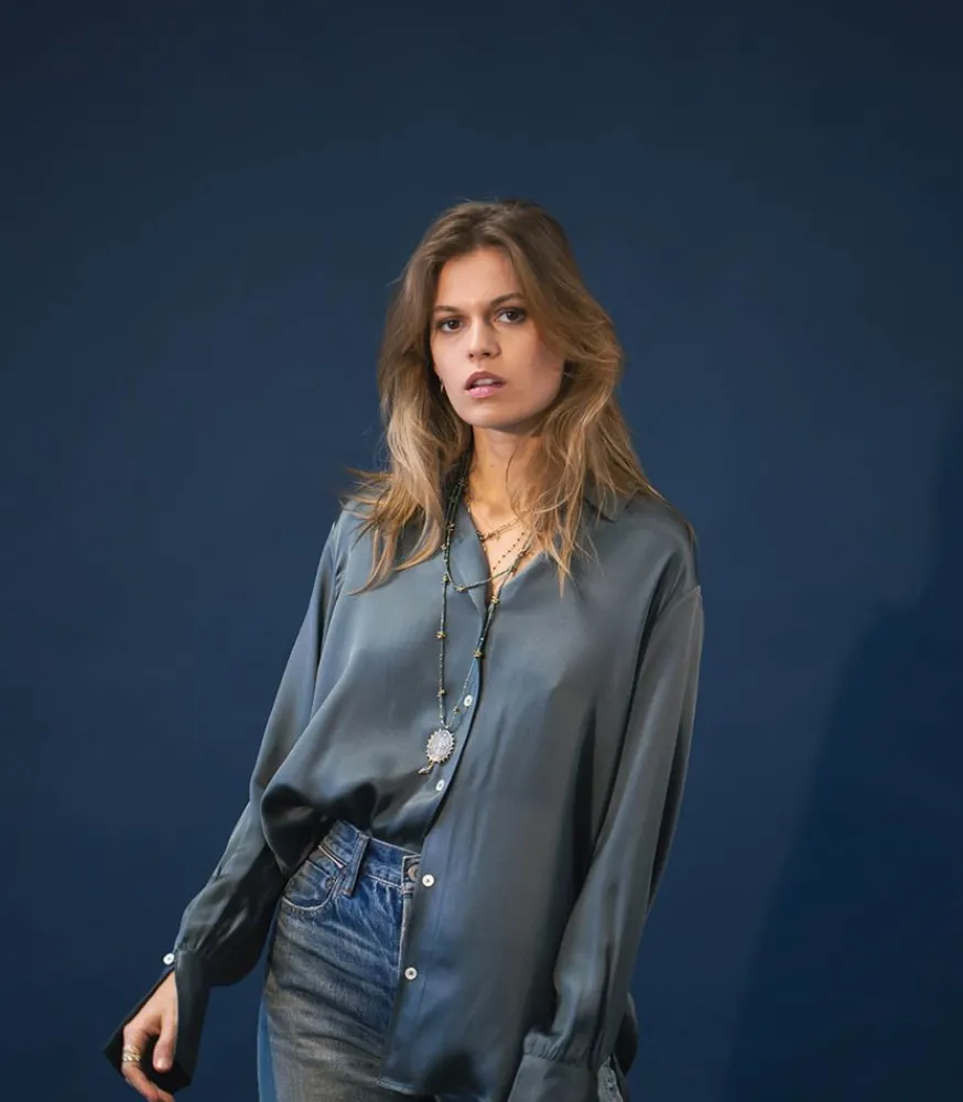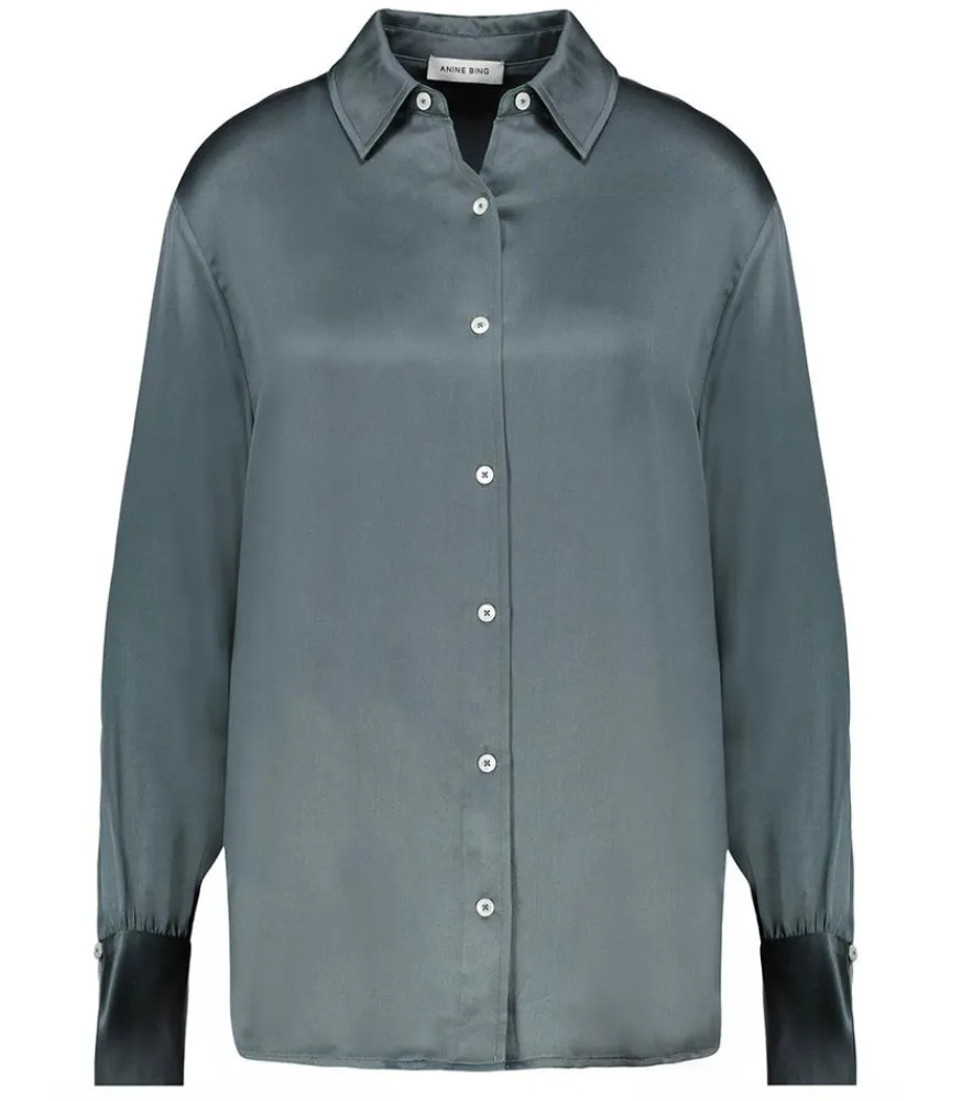 Chemise Monica Dark Sage Signée Anine Bing, Une Belle Chemise Classique Par Sa Forme, Élégante Par Sa Matière Et Tendance Avec Sa Jolie Teinte Vert Sauge. Parfaite Pour Une Tenue De Bureau Avec Un Jean Skinny Et Une Paire D’Escarpins, Ou Pour Le Soir Avec Un Jean Boyfriend Et Des Baskets.