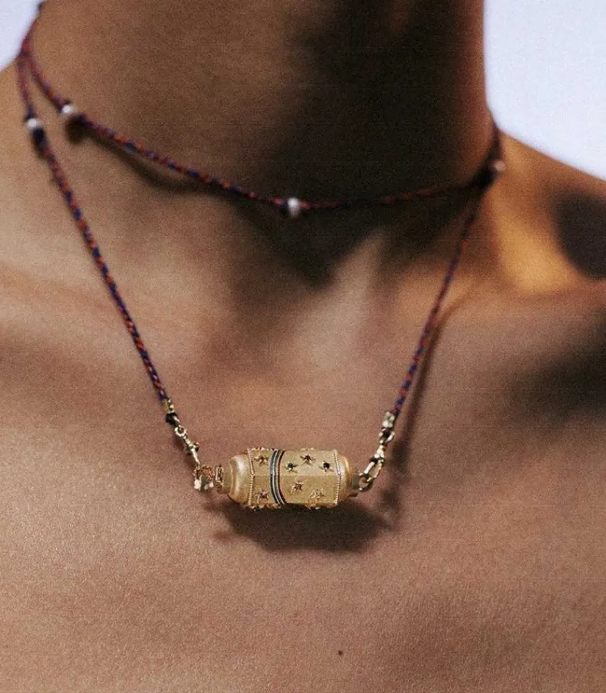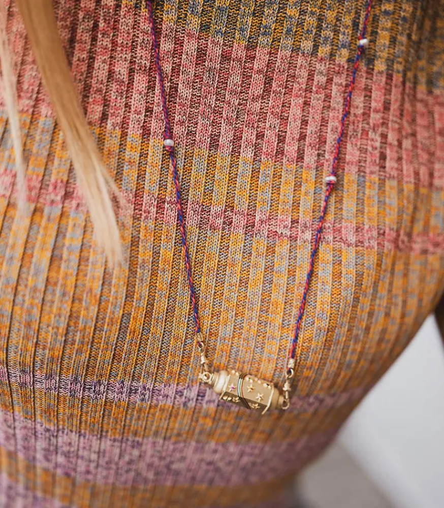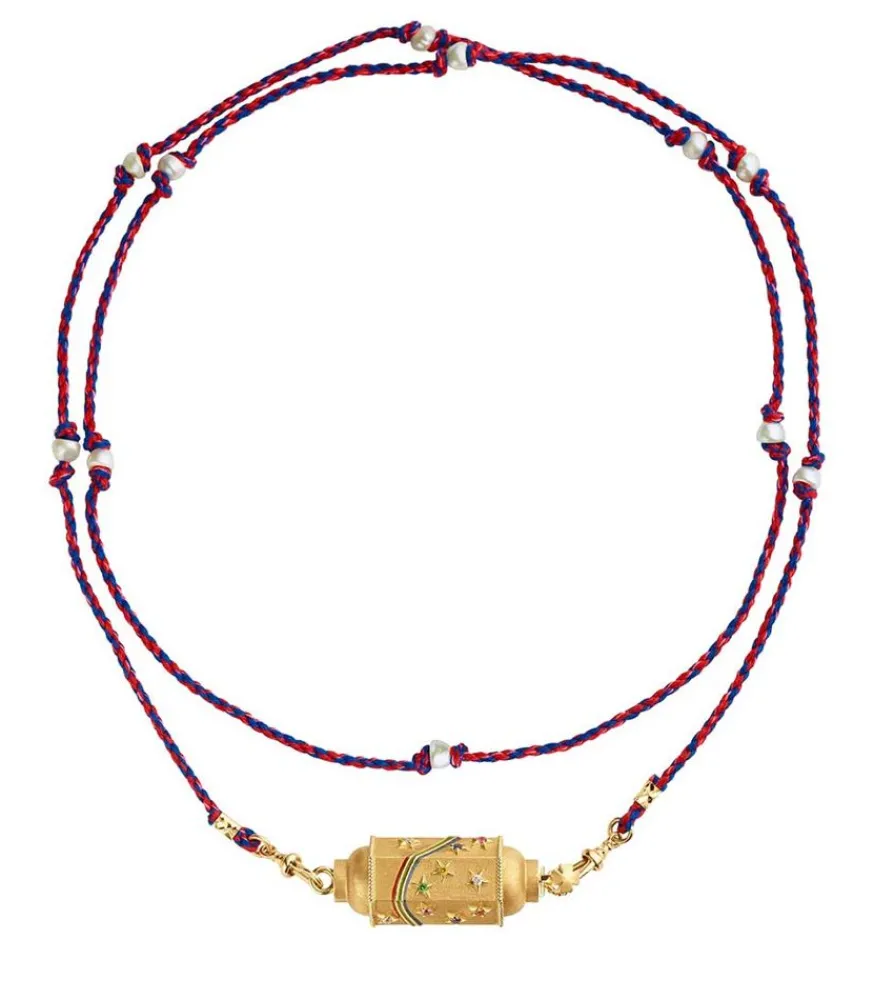 Collier Locket Rainbow Star – Mauli Red & Navy Marie Lichtenberg, Pendentif En Or Jaune 14 Carats, Avec Des Étoiles Serties De Saphirs Multicolores Et D’Un Arc En Ciel Émaillé, Avec Un Lien Mauli Rouge Et Navy De 73 Cm, Pouvant Se Porter En Double Tour.