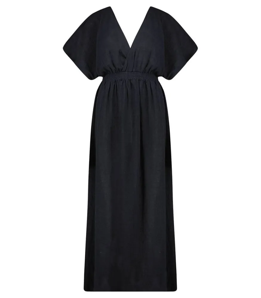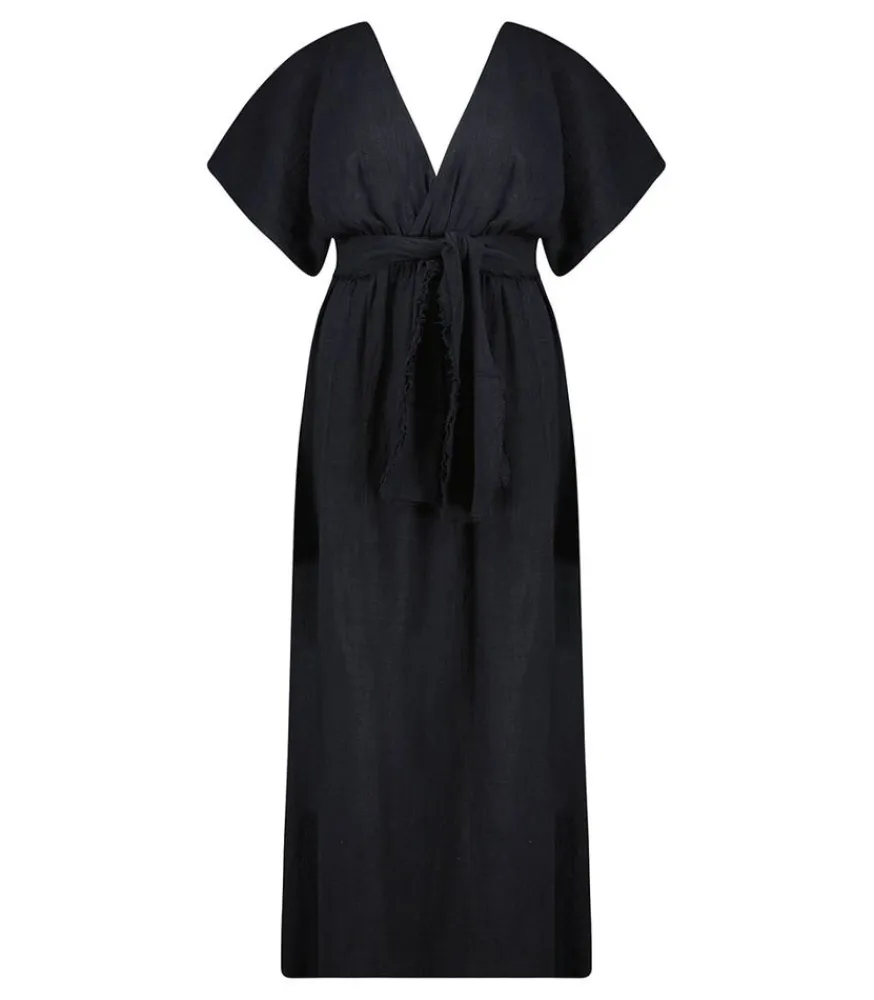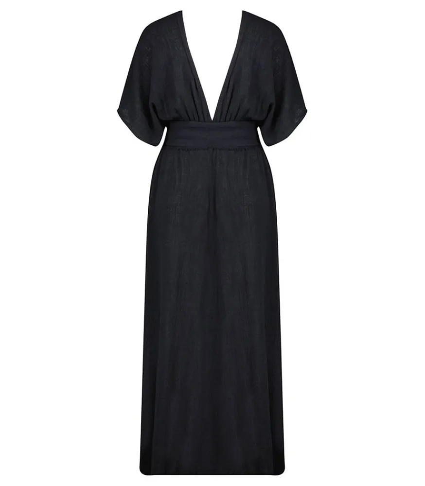 Robe Longue Empire Black Signée Maison Saint Julien, Faite À La Main De Manière Artisanale Dans Un Atelier Balinais Familial Et Traditionnel. Grâce À Sa Coupe Cache-Coeur Au Buste Et À Sa Taille Marquée, Elle Met En Valeur La Silhouette. Une Robe Légère Et Aérienne, Idéale Pour Une Soirée Sur La Plage Avec Une Paire De Sandales.
