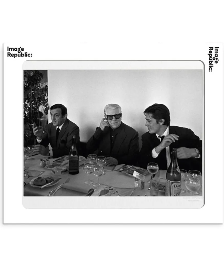 Affiche La Galerie Delon Gabin Ventura Déjeuner Éditée Par Image Republic, Un Élégant Tirage En Noir Et Blanc Représentant Les Acteurs Principaux Du Film Le Clan Des Siciliens, Alain Delon, Jean Gabin Et Lino Ventura, En Plein Déjeuner.