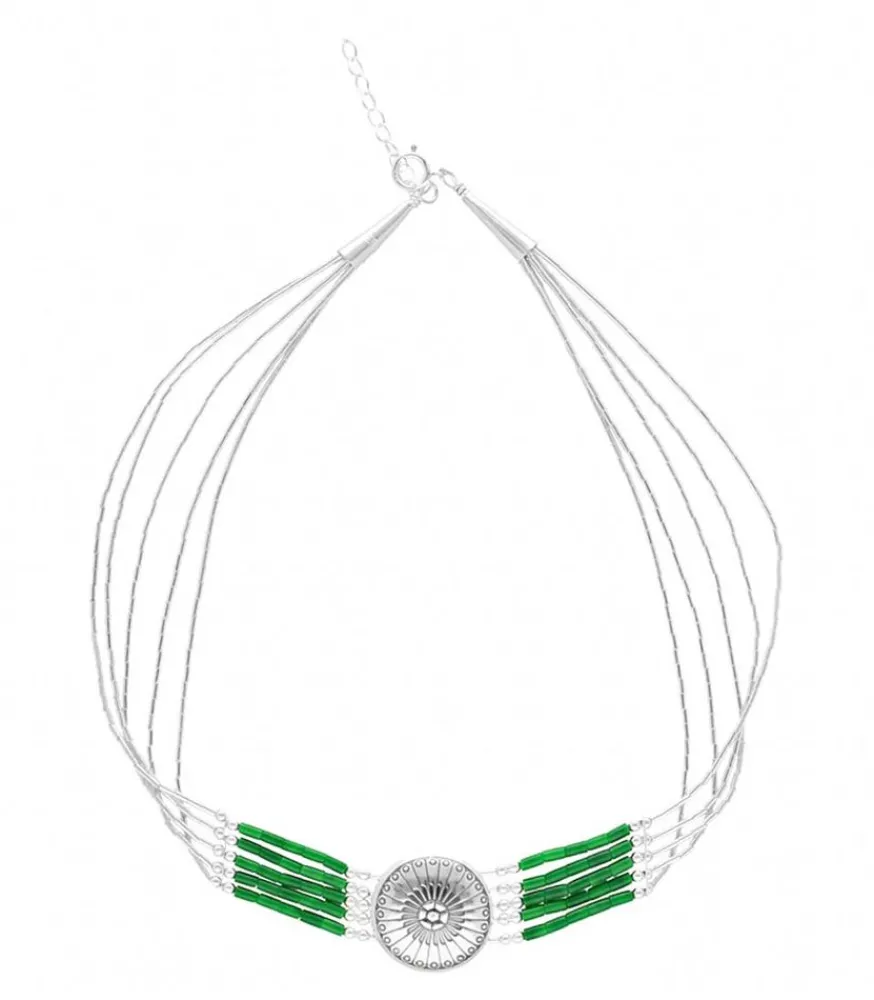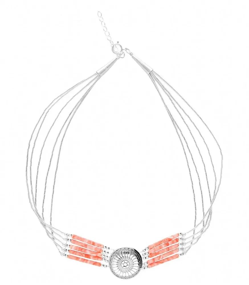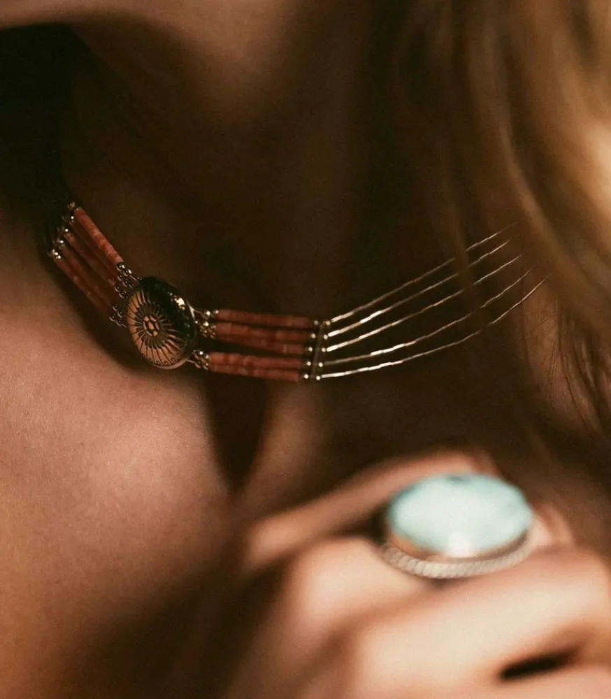 Harpo Présente Ce Collier Ras De Cou Amérindien Navajo À Cinq Rangs, Constitué De Perles Heishi Colorées Et D’Une Concha Centrale En Argent Massif 925.