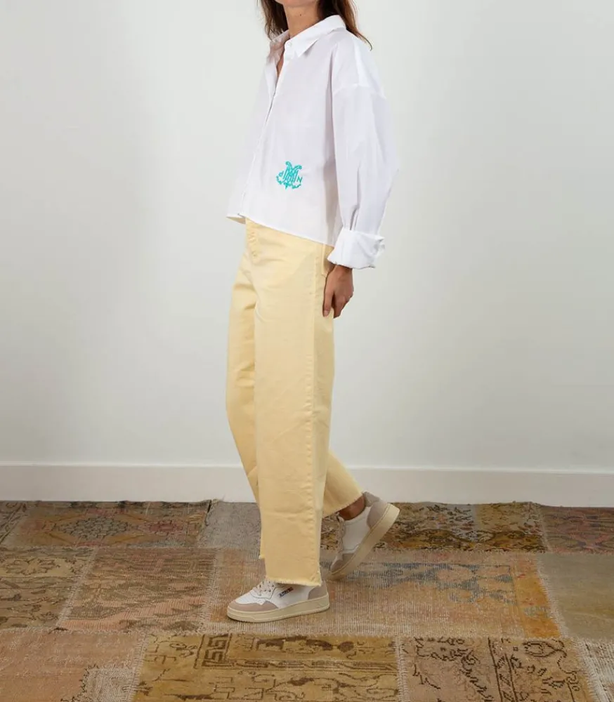 Jean Oversize En Denim Jaune Pâle De La Marque Happy Haus. Le Denim Très Fin Et Teinté D’Un Doux Jaune Pâle Dans Lequel Ce Modèle Est Conçu Lui Confère Un Aspect Quasi-Aérien.