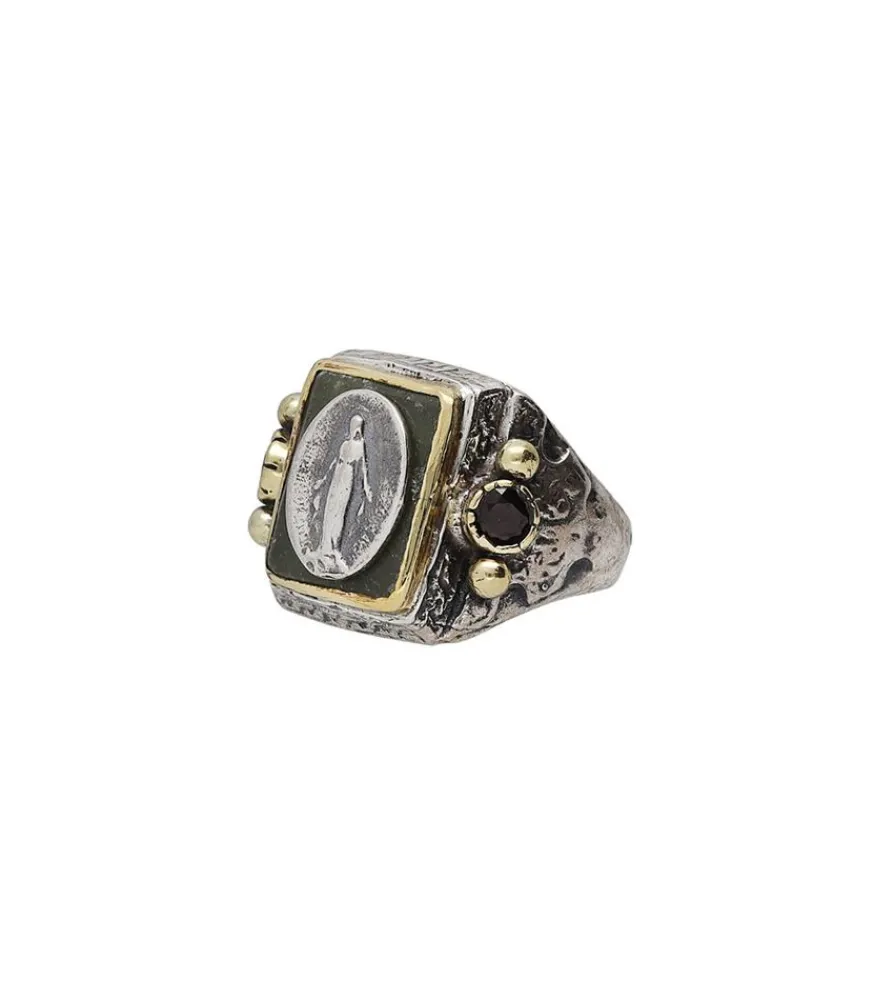 La Bague Richelieu Miraculous De La Marque Arkeology Paris Est Une Pièce De Bijouterie Qui Incarne L’Élégance Et La Signification Symbolique. Fabriquée En Argent Usé, Elle Présente Une Finition Martelée Qui Ajoute Un Aspect Texturé Et Vintage À La Bague. Au Centre De La Bague Se Trouve Une Représentation De La Figure Religieuse, Évoquant Des Thèmes De Spiritualité.