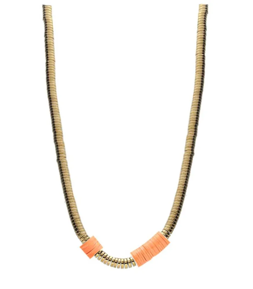 Maison Mönik Utilise Des Matières Brutes Un Brin Primitives Qui Lui Sont Chères. C’Est Ainsi Que Le Collier Hibiscus Se Pare De Perles En Laiton Et De Perles Oranges En Vinyle Recyclé Afin D’Apporter Une Touche De Douceur À Votre Décolleté.