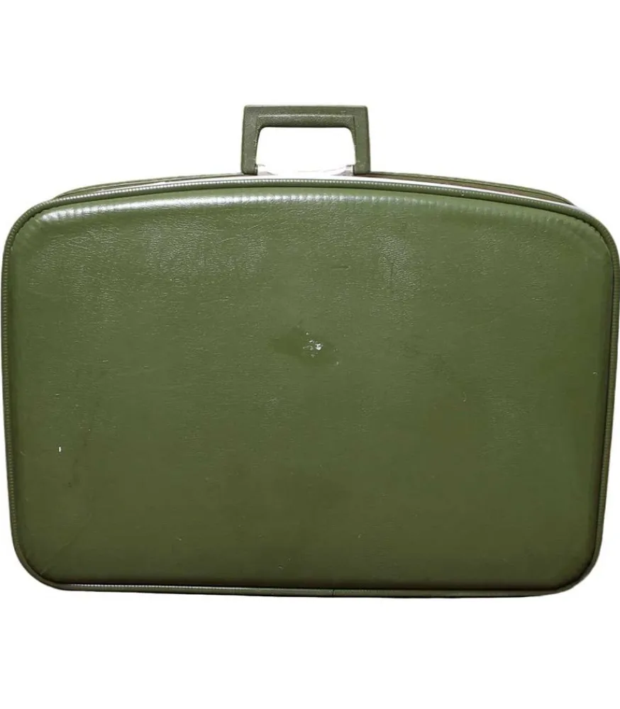Cette Grande Valise Customisée Se Compose De 2 Fermoirs Par Loquets Et D’Une Poignée Extérieure. Entièrement En Cuir Kaki À L’Extérieur, Son Intérieur Est Recouvert De Tissu Vert Satiné Et Matelassé.
