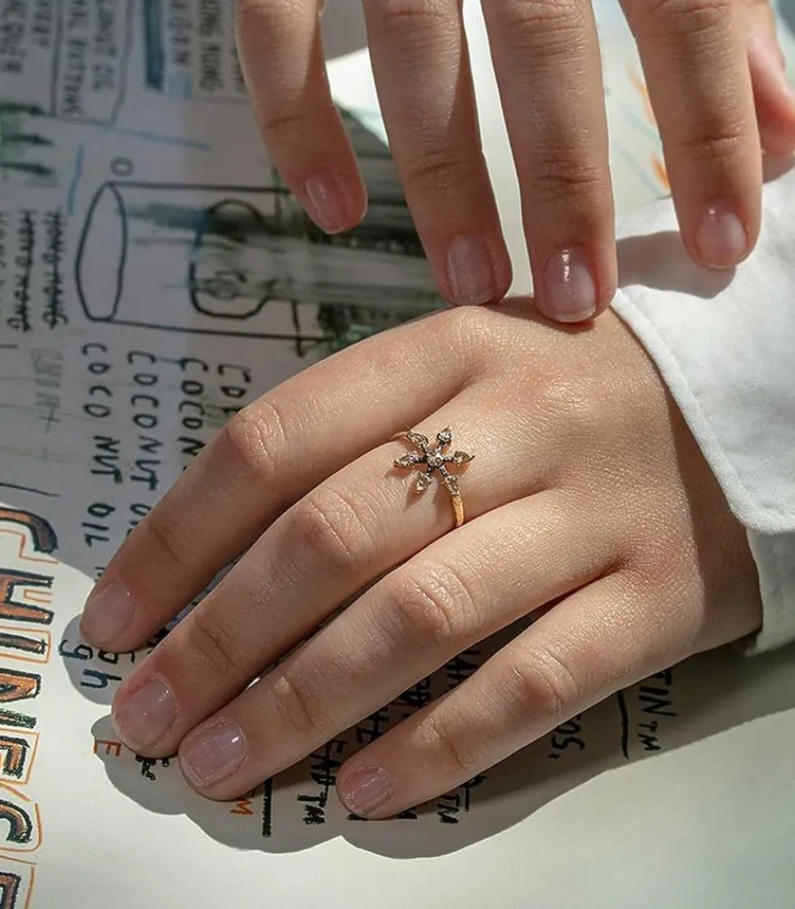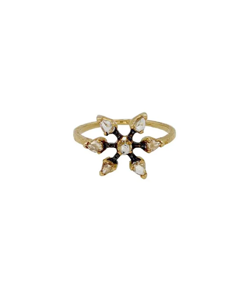 Resplandissante Par Ses Multiples Diamants Lumineux, La Bague Please Signée 5 Octobre Présente Une Forme De Croix Conçue Pour Épouser Parfaitement La Largeur Du Doigt. En Or Jaune 14 Carats Et Argent Noirci, Elle Est Sertie De Diamants Champagne Taille Rose À L’Ancienne Et Facettés, Aux Teintes Subtiles.