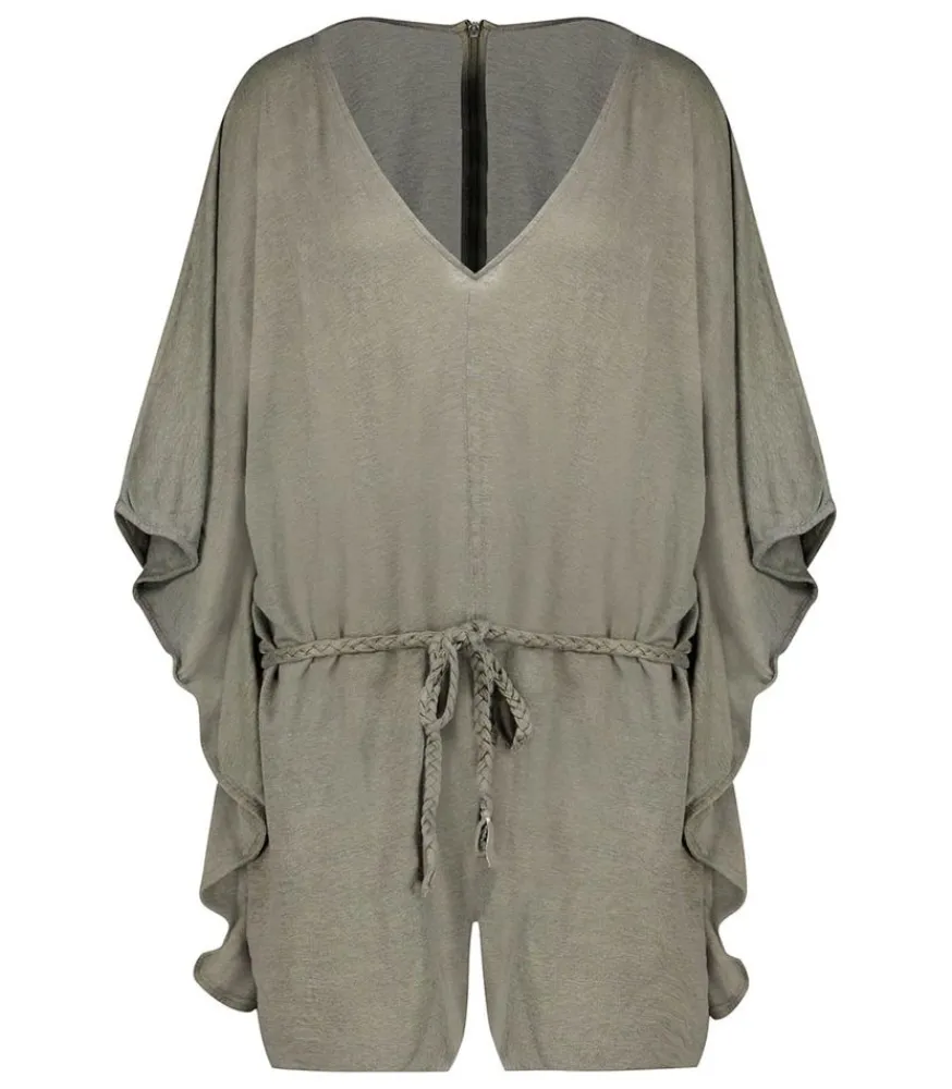 Combishort Col V Militaire De La Marque Majestic Filatures, À La Coupe Ample Et Carrée. On Marque La Silhouette Grâce Au Lien Tressé À La Taille Pour Donner De L’Allure. Un Joli Col En V Féminise Le Tout Et Des Coutures Sur Les Bords Donnent Un Côté Volanté.