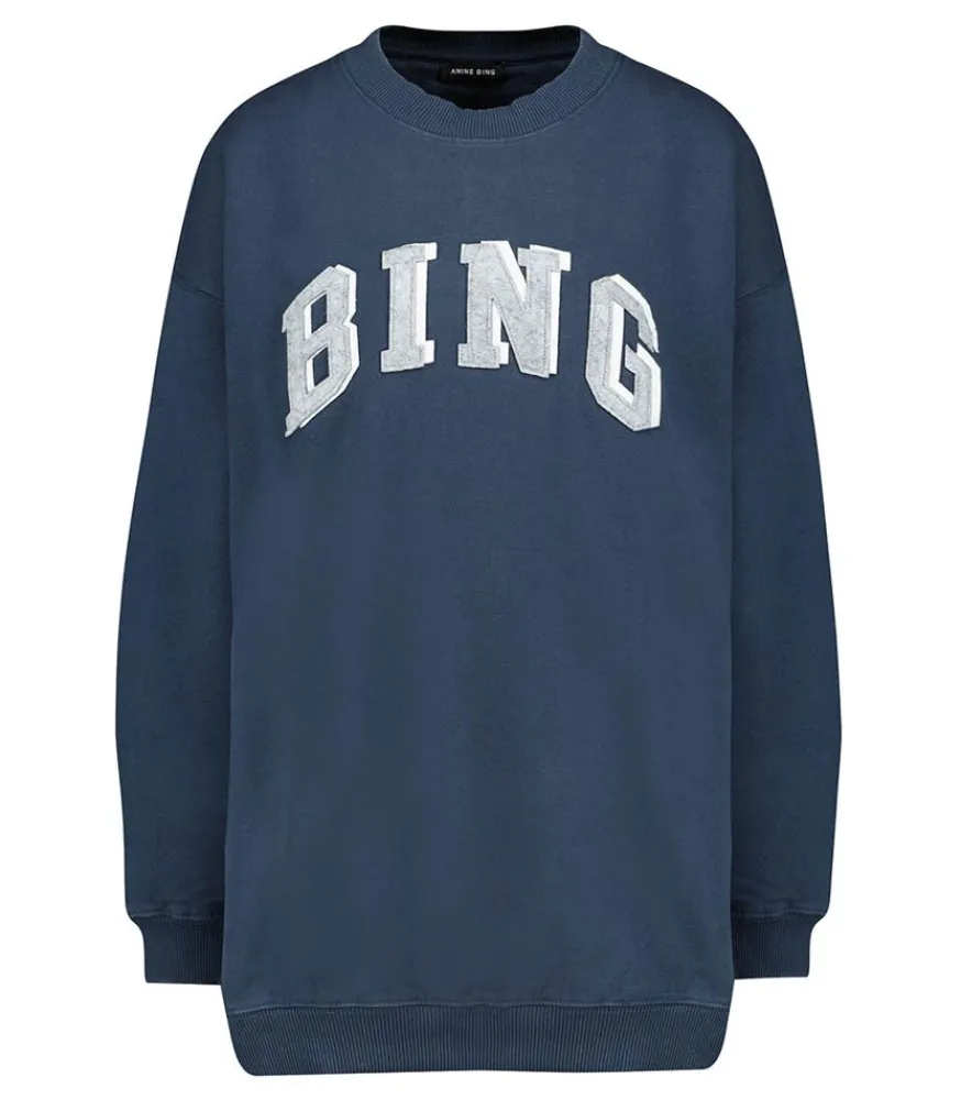 Sweat-Shirt Tyler Bing Navy Signé Anine Bing.Fabriqué À Partir De Molleton 100 % Coton Biologique Dans Un Délavage Bleu Marine, Ce Pull Se Distingue Par Son Charme Décontracté. Il Présente Un Graphisme En Lettres Blanches Sur La Poitrine, Ajoutant Une Touche D’Inspiration Athlétique À Son Look. Coupe Oversize Offrant Un Confort Ultime.