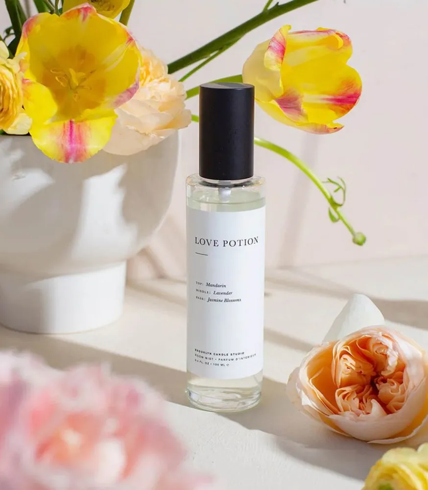 Brume D’Ambiance Love Potion De La Marque Brooklyn Candle Studio. Profitez D’Un Parfum Doux Aux Arômes Exotiques De Fleurs De Jasmin, De Lavande Apaisante Et De Mandarine Éclatante. Une Expérience Olfactive Évoquant Un Bouquet De Fleurs Sauvages Fraîchement Cueillies.