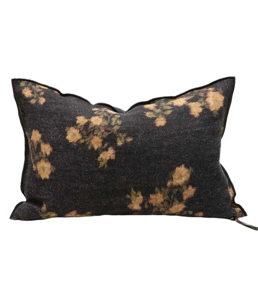 Coussin Vice Versa Lin Wabi-Sabi 30 X 50 Cm De La Marque Maison De Vacances. Coussins En Lin Épais D’Aspect Texturé, Coloris De Fond Carbone. L’Impression Représente Des Fleurs Avec Un Esprit Vintage Délavé. Petit Lien En Cuir Lamé Champagne En Finition À La Fermeture Éclair. Vendu Avec Garniture.