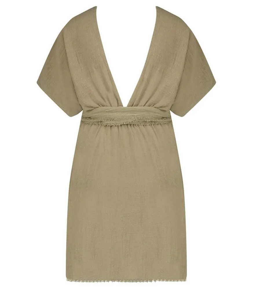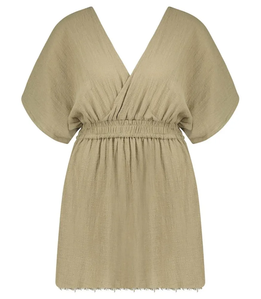 Robe Courte Empire Khaki Signée Maison Saint Julien, Entièrement Conçu En Coton Froissé Léger Et Aérien. Cette Robe Courte À La Coupe Babydoll Met En Valeur La Silhouette Et La Poitrine Avec Son Décolleté Croisé Et Sa Taille Cintrée Pour Une Allure Féminine. Cette Pièce Est Fabriquée À La Main À Bali, Par Un Atelier Local Et Familial, Dans Le Respect Du Savoir-Faire Traditionnel. Une Pièce Parfaite Pour Enfiler Par-Dessus Son Maillot Après La Plage.