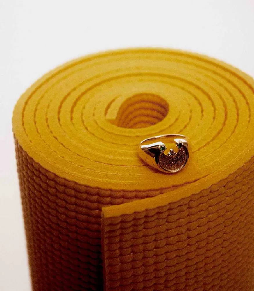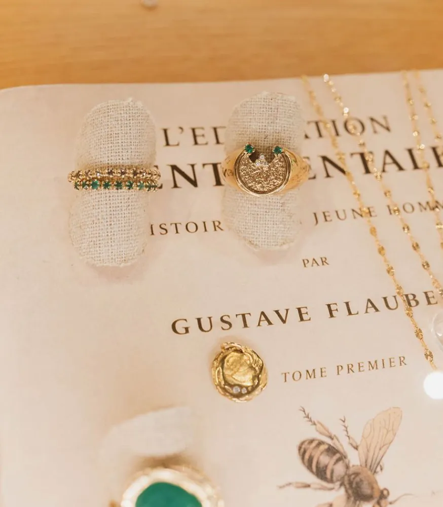 Bague Mira De La Marque Pascale Monvoisin. Cette Chevalière Conçue En Or Jaune 9 Carats Est Sertie De Diamants Et D’Emeraudes. Porté Sur Le Doigt De Votre Choix, Ce Modèle Vient Habiller La Main.
